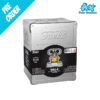 This exclusive collectible comes on a detachable base and is packaged in a silver-tone window box, which nests within a tin, protective case. The tin case is lined with a black, velvety cushion, and has been embossed to resemble a vault door, which opens on a hinge to reveal Pop! WALL-E!